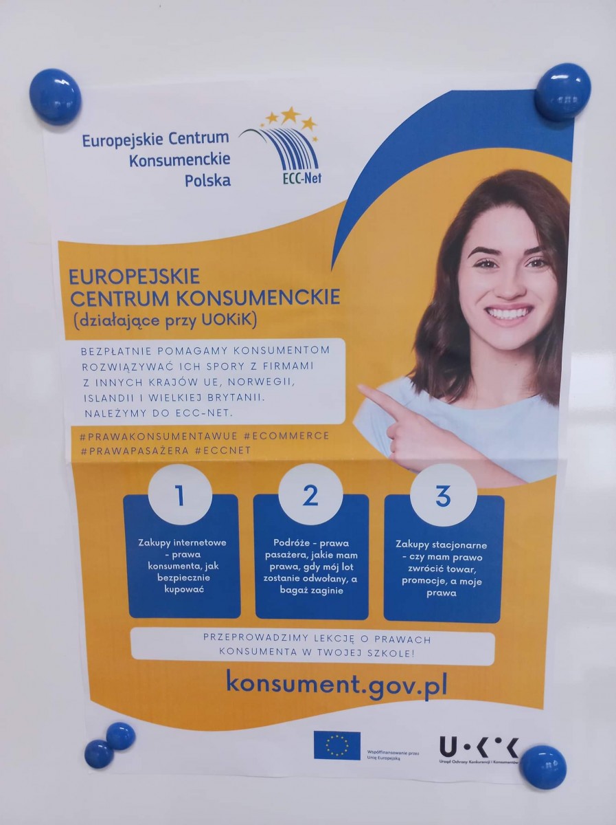 17 listopada br. przedstawiciel Europejskiego Centrum Konsumenckiego poprowadzi zajęcia edukacyjne dla uczniów naszej szkoły, podczas których dowiemy się m.in.: jakie mamy prawa dokonując zakupów przez internet lub stacjonarnie, czy możemy zwrócić zakupiony towar oraz jakie prawa ma pasażer linii lotniczych np. przy odwołanym bądź opóźnionym locie.