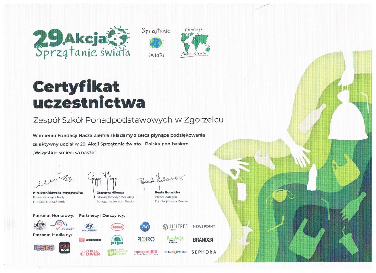 Z wielką przyjemnością informujemy, że nasza szkoła otrzymała certyfikat od Fundacji Nasza Ziemia za udział w 29. edycji Akcji „Sprzątanie Świata” Polska 2022.