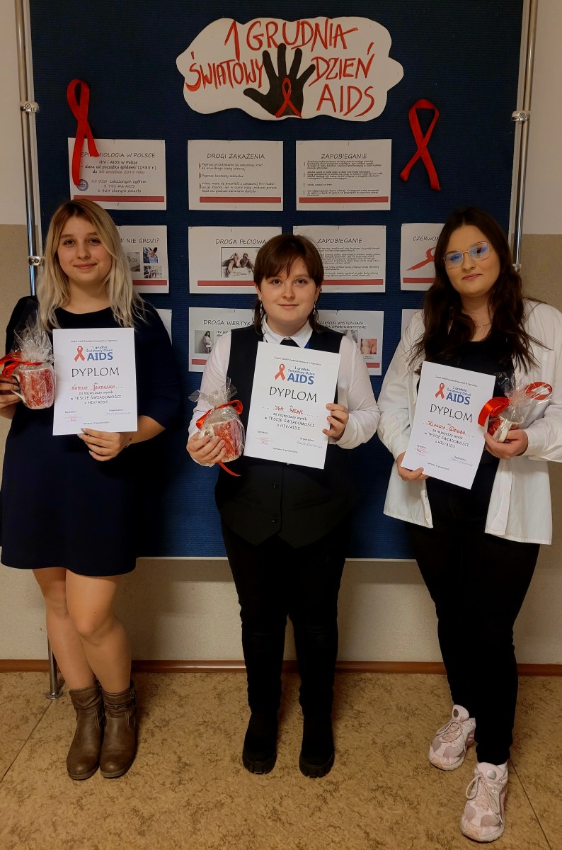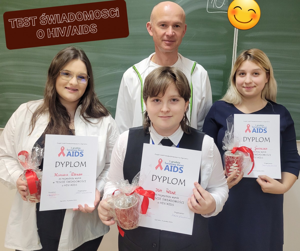 Od 1988 roku dzień 1 grudnia jest obchodzony jako Światowy Dzień AIDS. W tym dniu w szkole odbył się Test Świadomość o AIDS. Ponad 200 uczniów miało możliwość sprawdzenia wiedzy na temat HIV, AIDS i chorób przenoszonych drogą płciową. Najwyższą wiedzę z tego zakresu wykazały się: Jaworska Natalia, Dziuba Klaudia, Wenc Iga. Gratulujemy wiedzy! Dziewczęta będą reprezentowały szkołę w Powiatowym Konkursie wiedzy o HIV/AIDS.