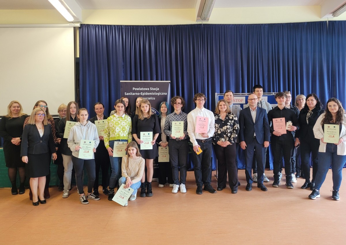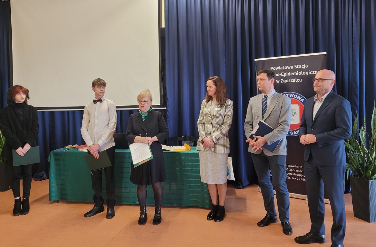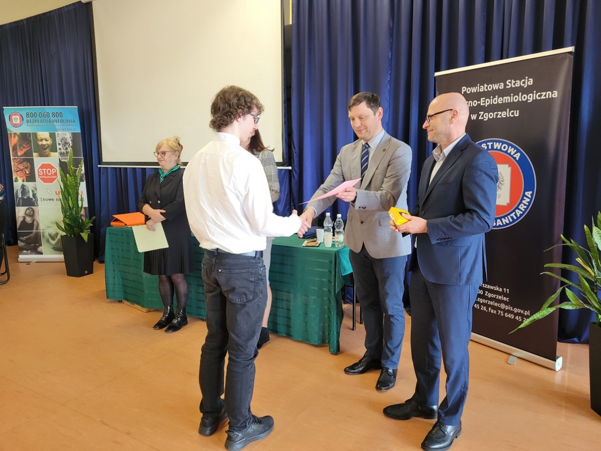 Nagrody wręczyła Dyrektor Zespołu Szkół Ponadpodstawowych w Zgorzelcu - Pani Monika Listwan, Etatowy Członek Zarządu Powiatu Zgorzeleckiego – Pan Ireneusz Owsik oraz Pan Andrzeje Kellner – Dyrektor Powiatowej Stacji Sanitarno – Epidemiologicznej w Zgorzelcu.