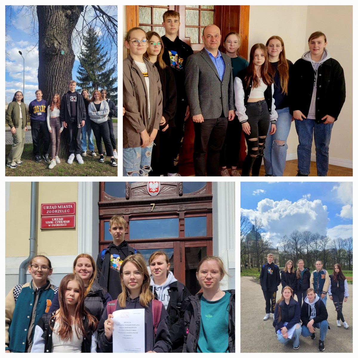 26 kwietnia br. grupa uczniów z klasy 1 Technikum Architektury Krajobrazu spotkała się z Panem Rafałem Groniczem Burmistrzem Miasta Zgorzelec, któremu wręczyła petycję w sprawie wyeksponowania drzew pomnikowych na ulicy Francuskiej oraz ulicy Powstańców Śląskich w Zgorzelcu. Uczniowie poprosili w petycji o: oznaczenie drzew pomnikowych tabliczką z danymi drzewa, promocję drzew pomnikowych w folderach i ulotkach, organizowanie akcji mających na celu powoływanie nowych pomników przyrody.