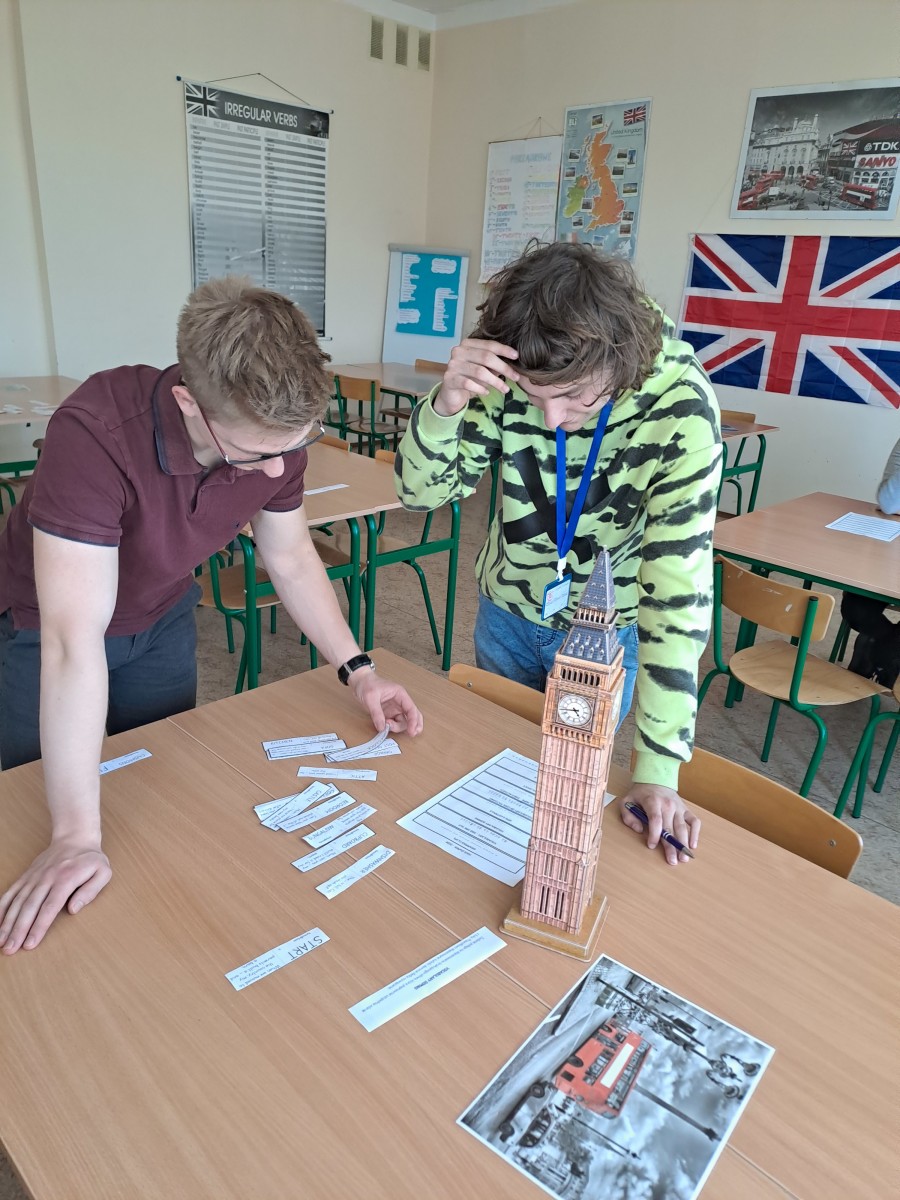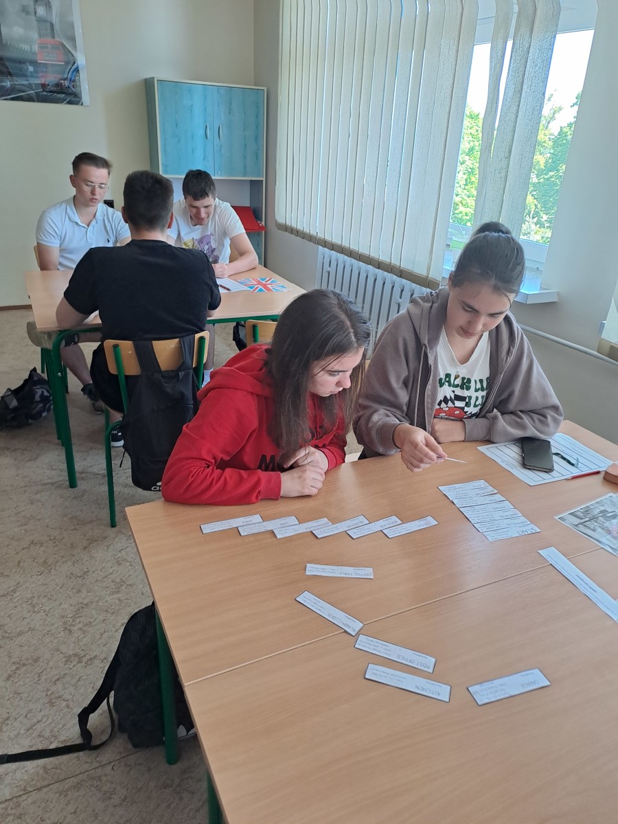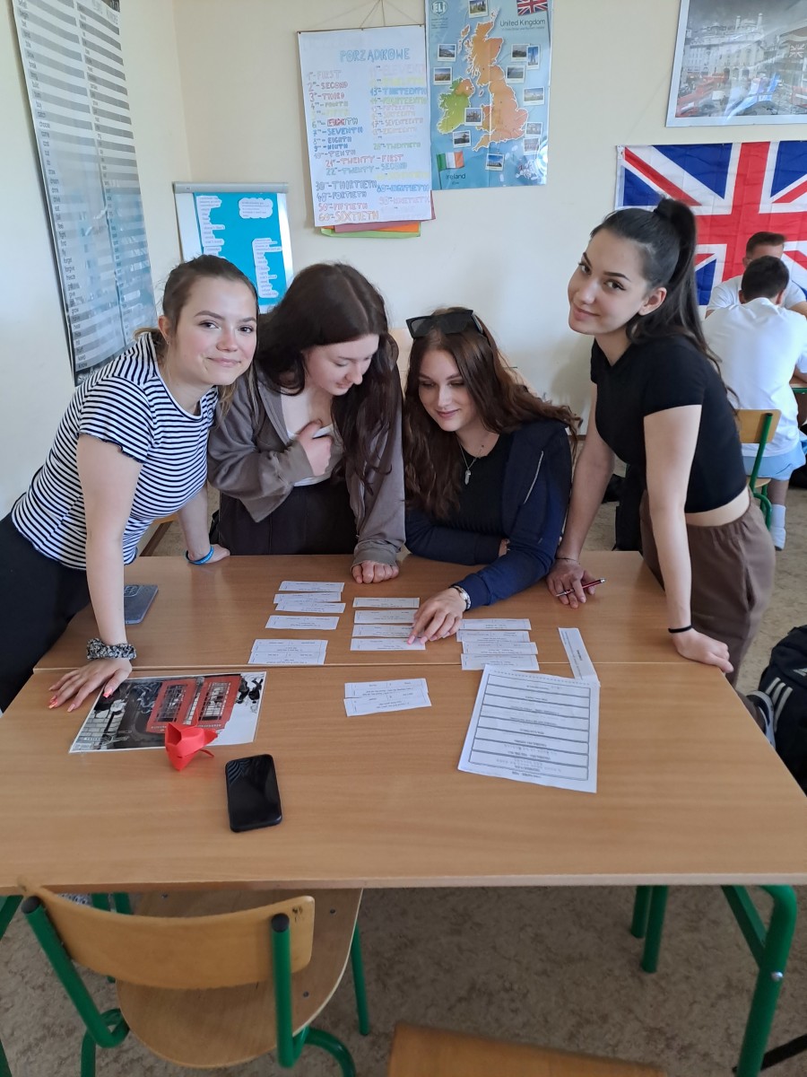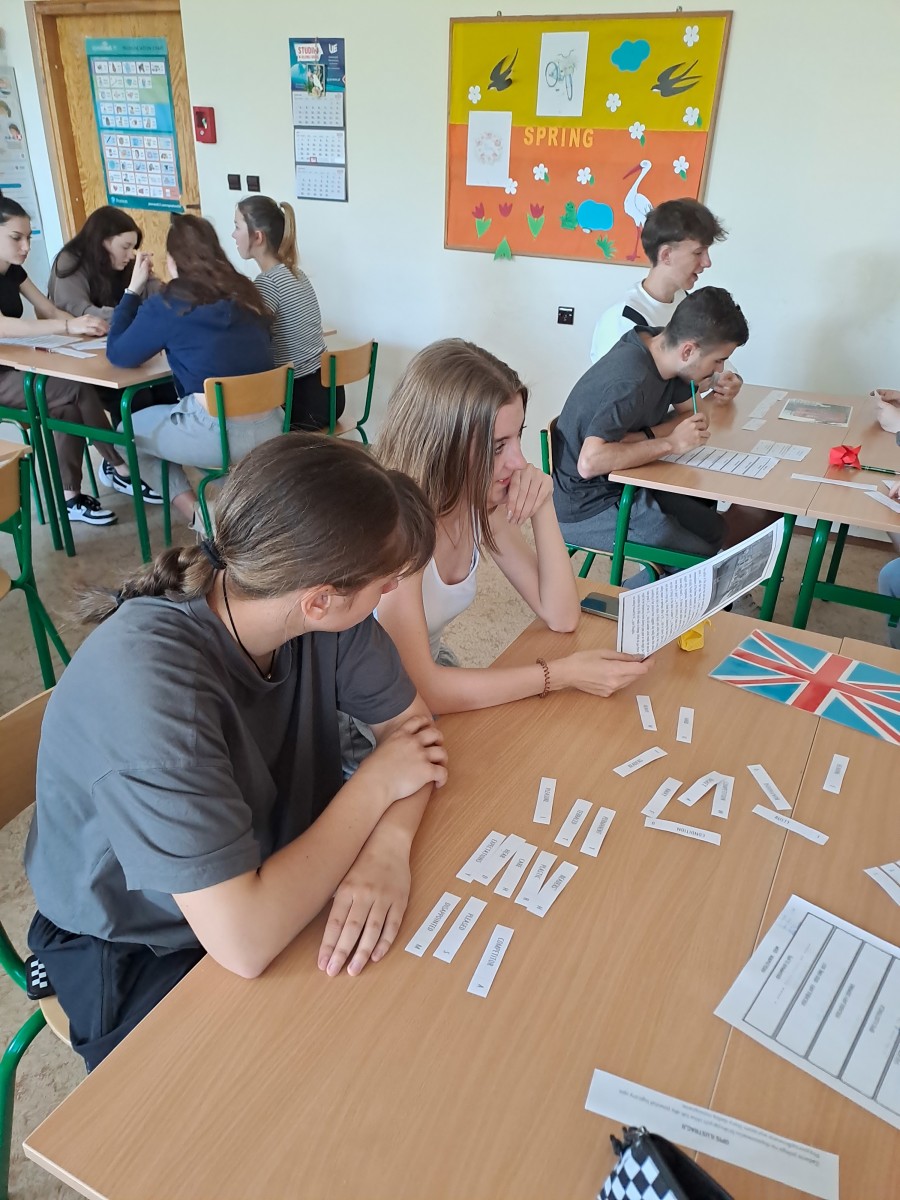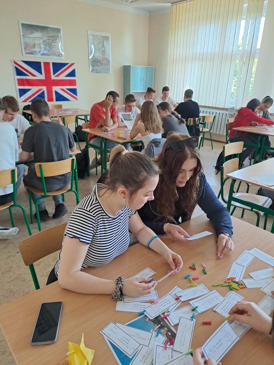 Uczniowie klasy 3 LE na lekcji języka angielskiego rozwiązywali zadania w formie stacji dydaktycznych. Stacje dydaktyczne to jedna z metod aktywizujących, gdzie uczniowie podchodzą do przygotowanych stanowisk i rozwiązują zadania, a powstałe hasła zapisują w hasłowniku. Uczniowie rozwiązując zadania dobrze się bawili, rywalizowali ze sobą i powtarzali słownictwo. Drużyna, która rozwiązała najwięcej zadań otrzymała ocenę cząstkową z języka angielskiego.