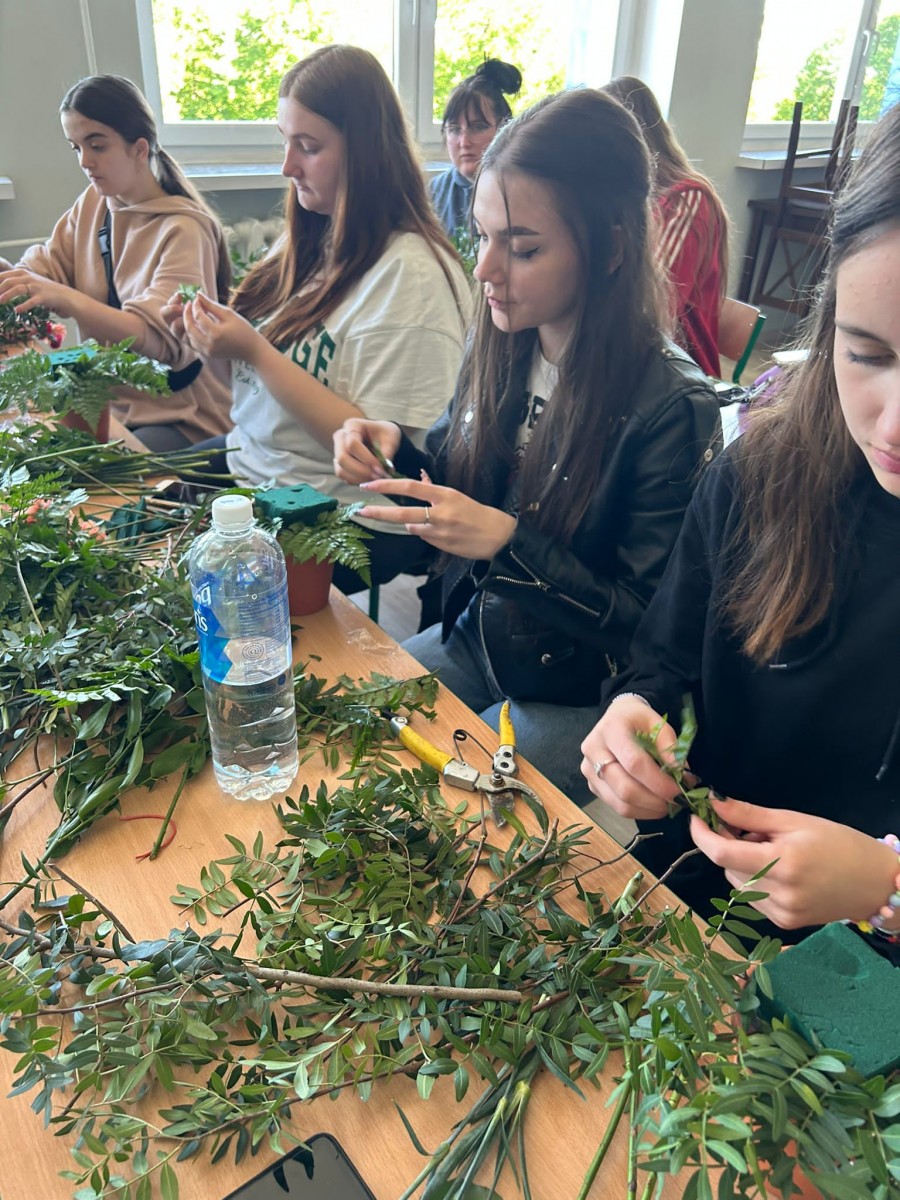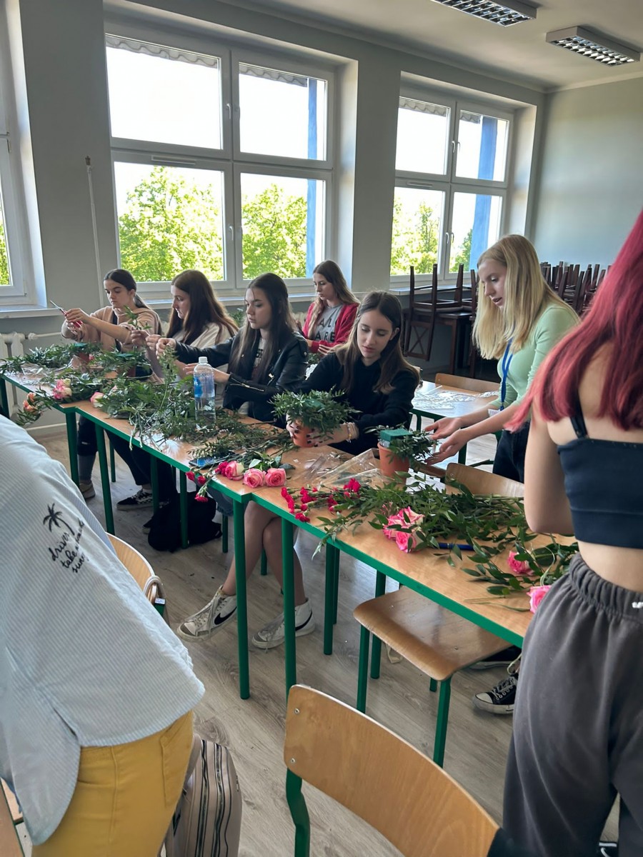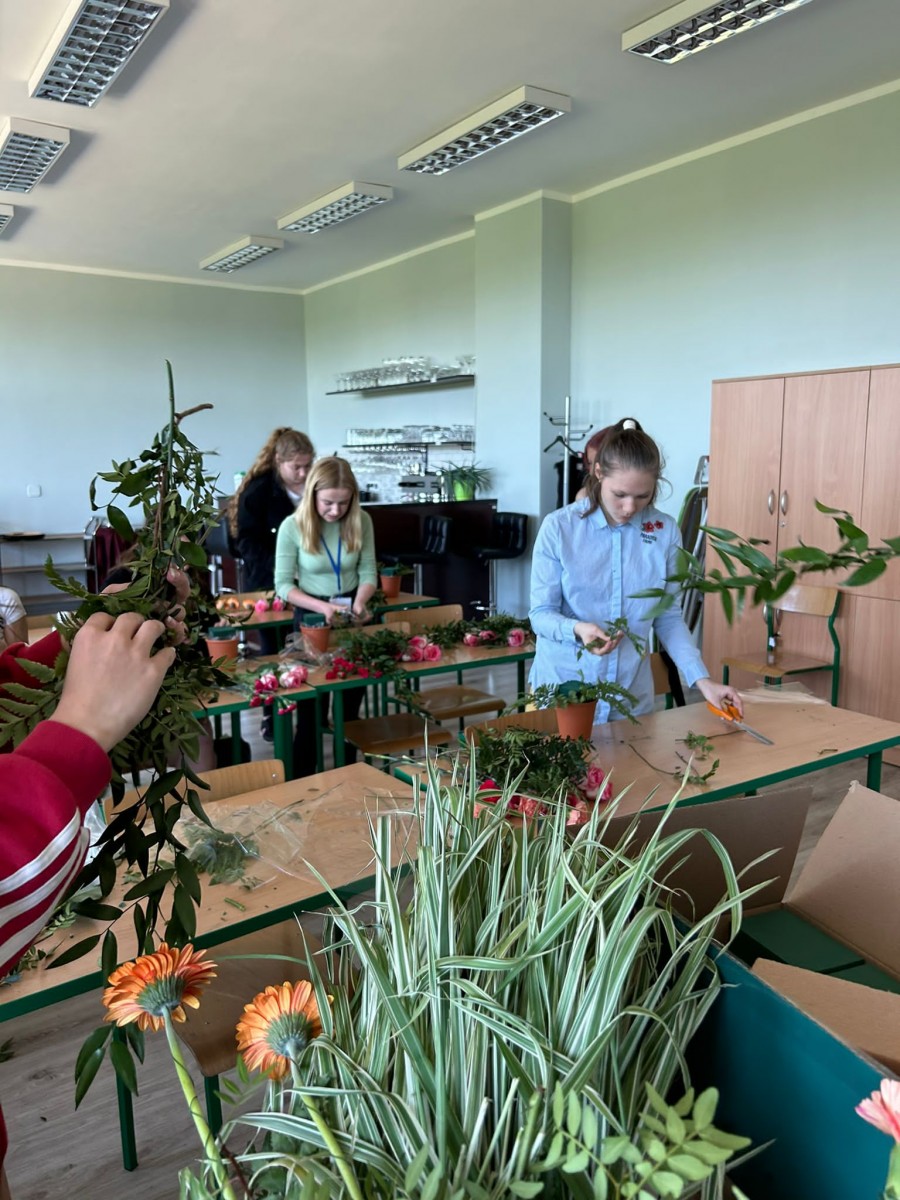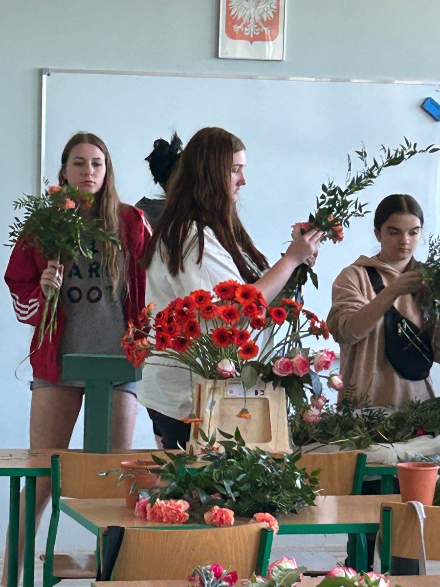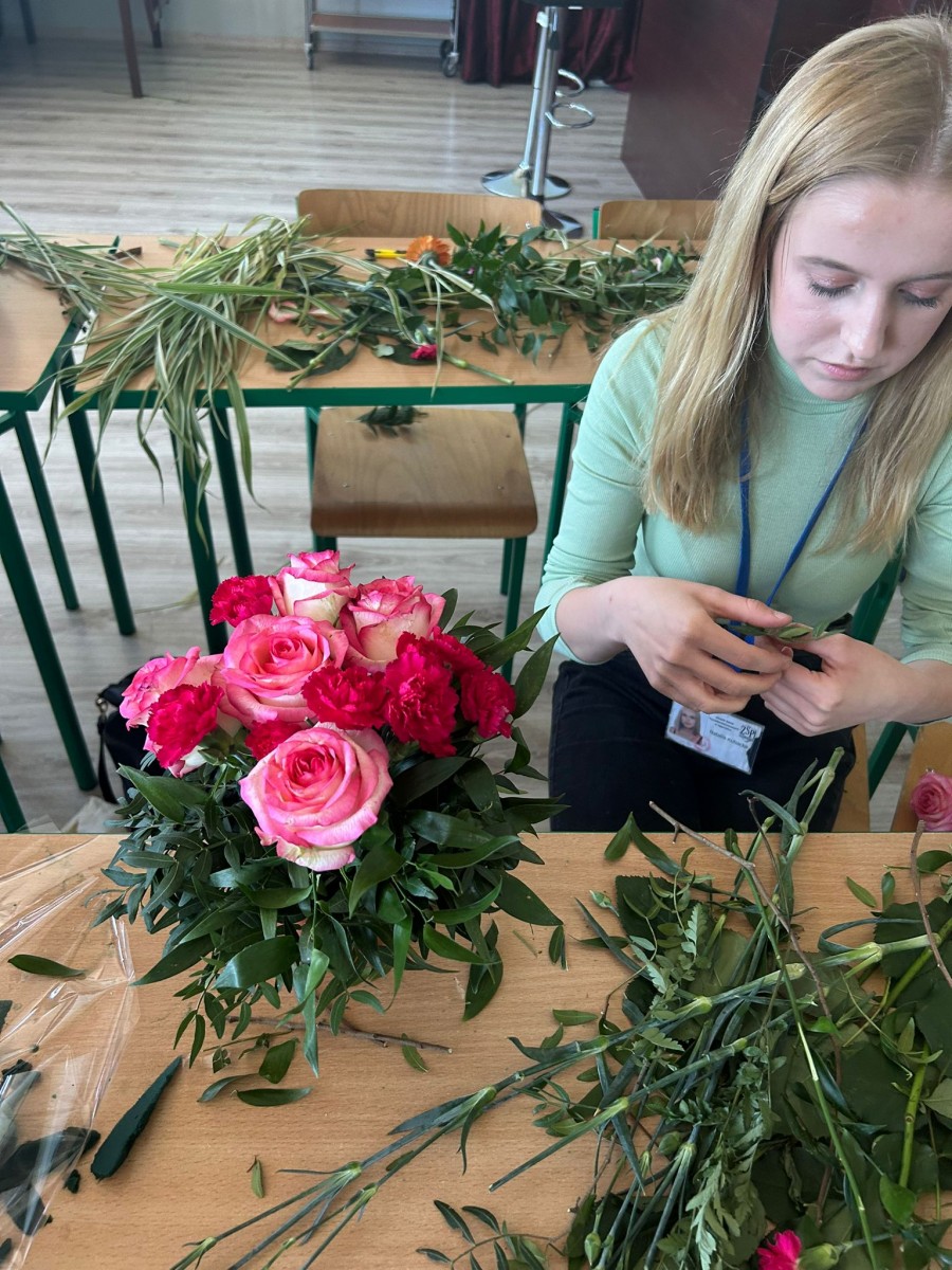 Zajęcia z florystyki ??? Nie, nie. To warsztaty z dekoracji stołów konsumenckich świeżym kwiatami. Zajęcia dla technikum żywienia i usług gastronomicznych w ramach projektu „Zawód przyszłości”.