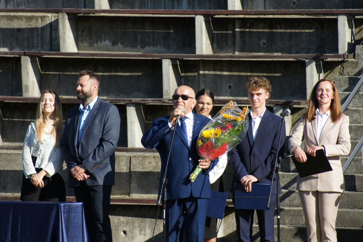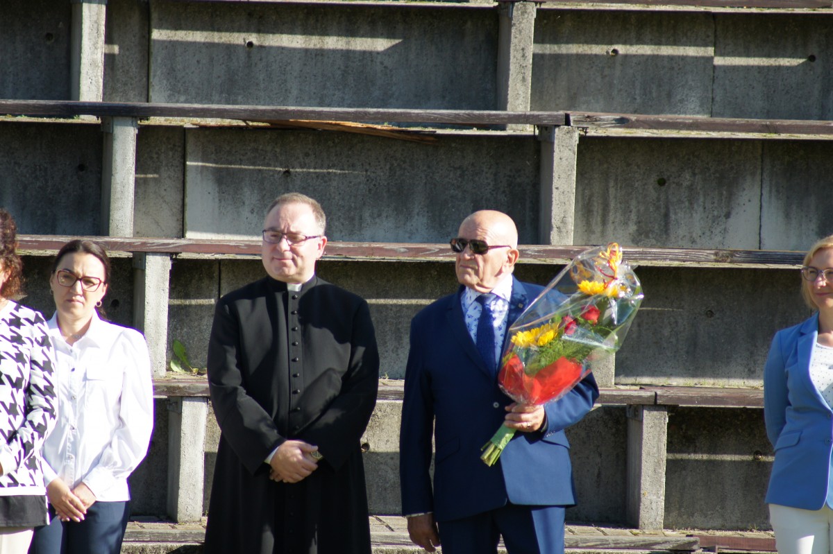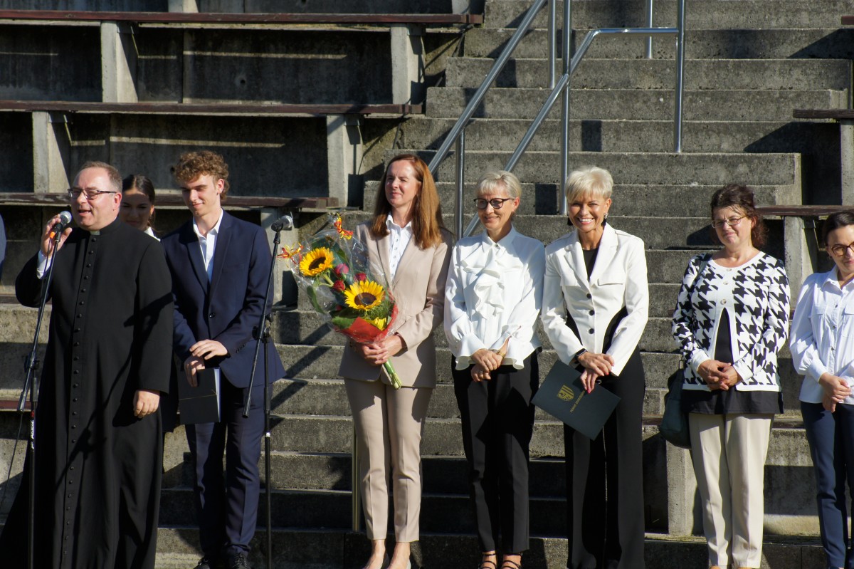 Następnie przedstawiła nowych pracowników Szkoły. Szczególnie ciepłe słowa powitania skierowała do ponad 400- osobowej grupy uczniów sześciu klas technikum oraz siedmiu klas Branżowej Szkoły I Stopnia, którzy rozpoczynają naukę w naszej Szkole. Wszystkim życzyła wielu sukcesów, wytrwałości w realizacji celów oraz powodzenia w zdobywaniu wiedzy i nowych umiejętności. Podobne życzenia skierowali do młodzieży zaproszeni goście: Pani Agnieszka Budych Dyrektor Wydziału Edukacji, Kultury i Sportu, Pan Franciszek Wurszt - straszy cechu rzemiosł różnych oraz ks. proboszcz parafii św. Jana Chrzciciela w Zgorzelcu – Mirosław Makowski.