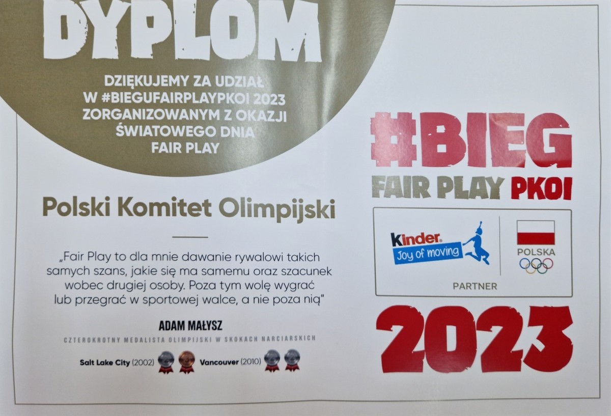 Dzisiaj otrzymaliśmy dyplom Fair Play Polskiego Komitetu Olimpijskiego. Dyplom ten został przyznany za promocję idei fair play wśród jak największej liczby uczniów.