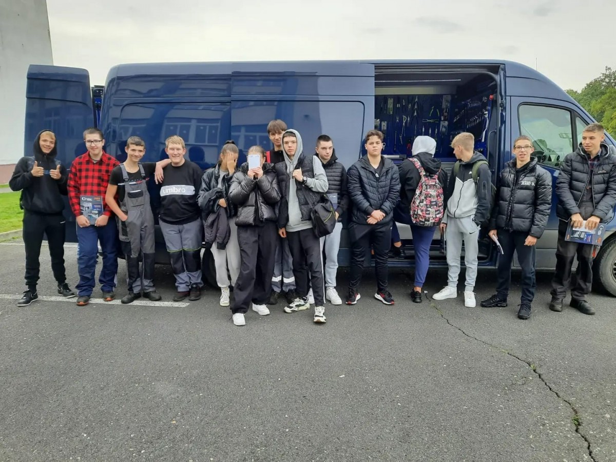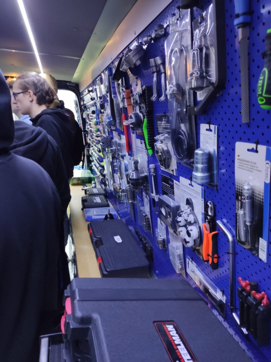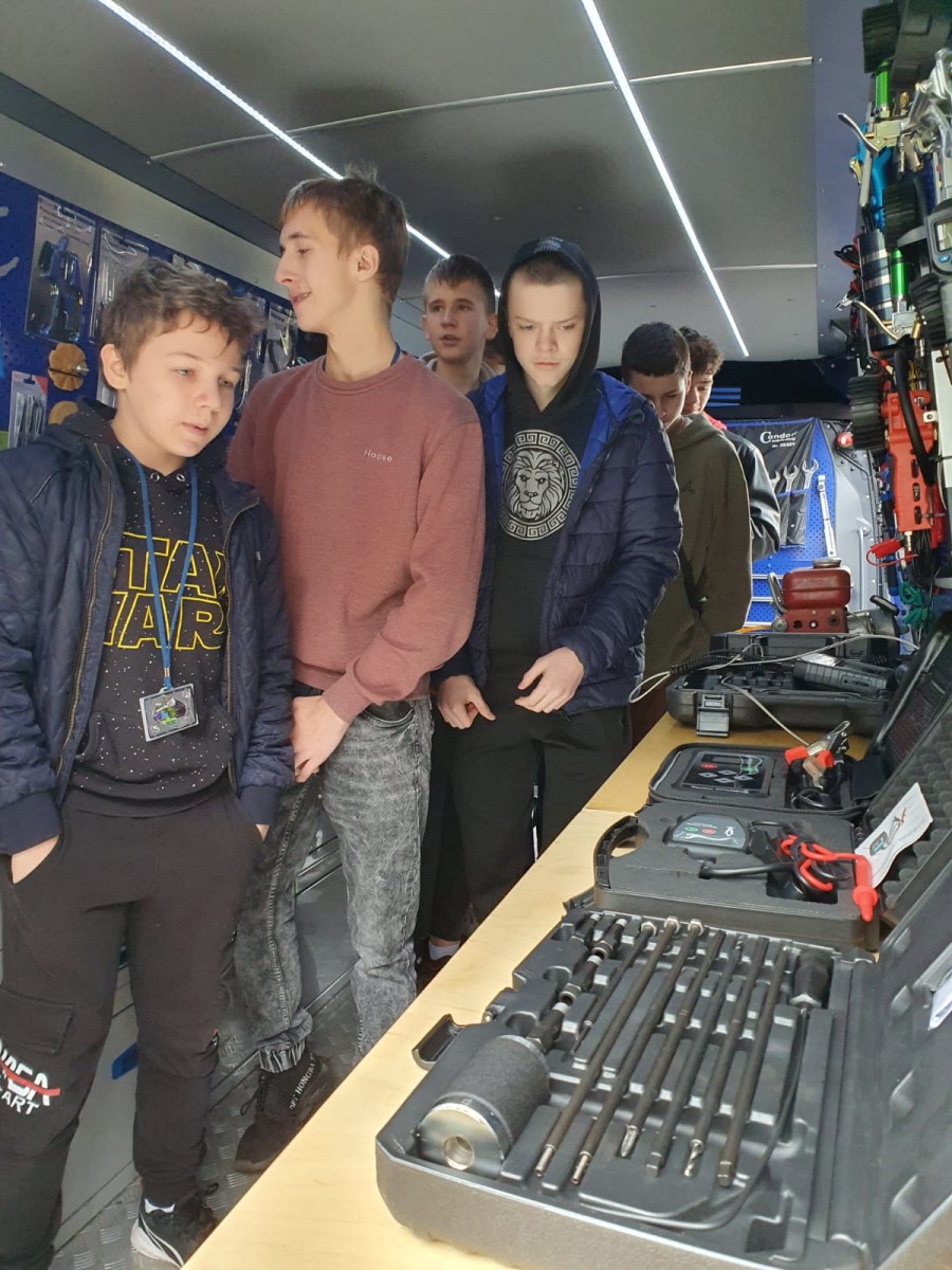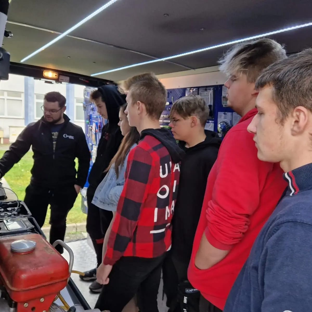 Prezentacja narzędzi w specjalnie przystosowanym narzędziobusie z firmy Condor Tools z Zielonej Góry dla klas o kierunku samochodowym i elektrycznym.