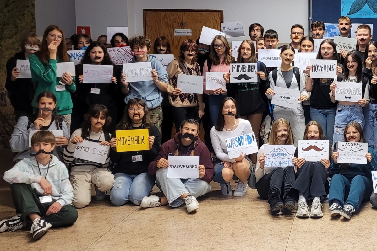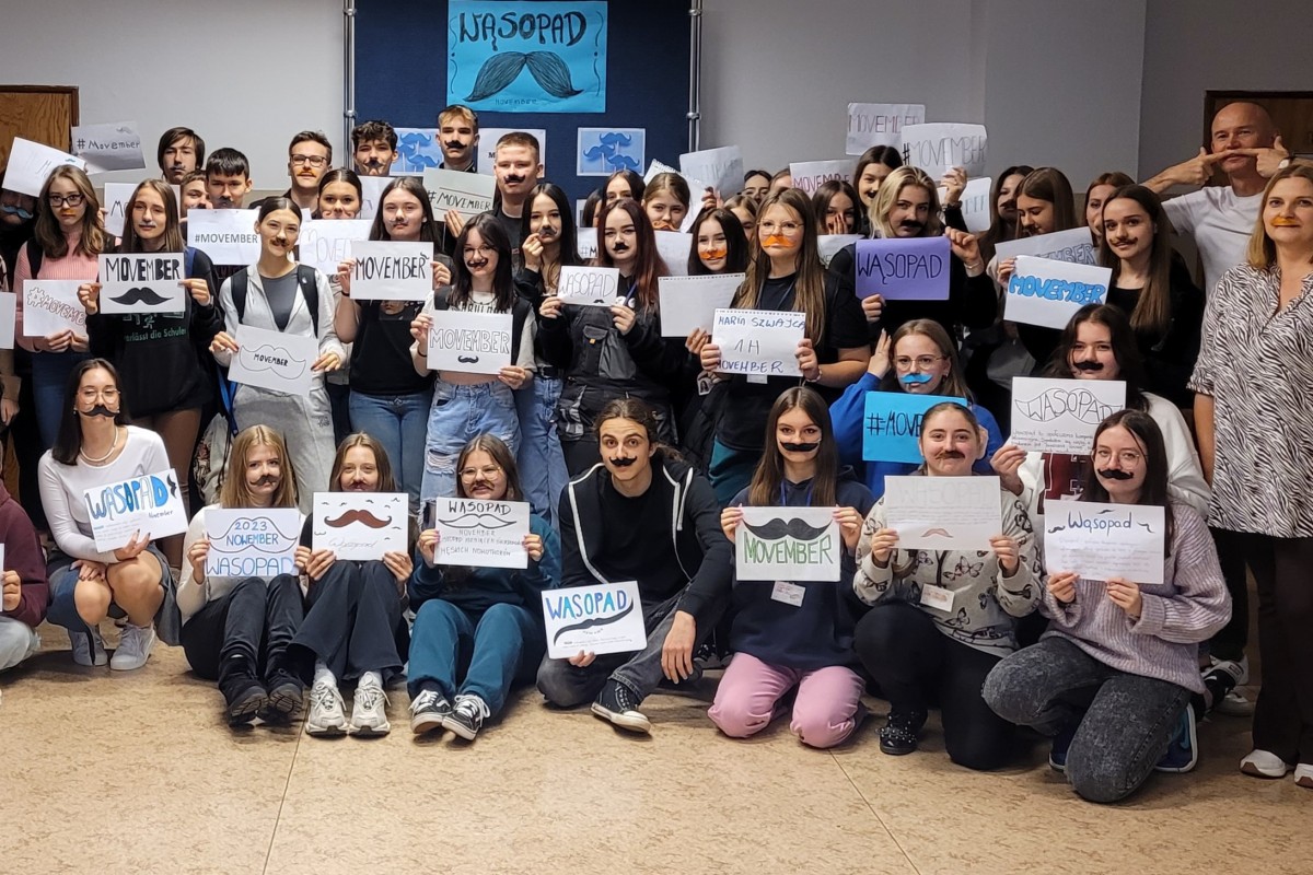 17 listopada br. młodzież oraz nauczyciele naszej szkoły i zapuścili sztuczne wąsy na znak solidarności z mężczyznami, a także aby wzbudzić ciekawość otoczenia oraz zapoczątkować dyskusję na temat profilaktyki nowotworów prostaty oraz jąder. Movember, czyli Wąsopad to trwająca cały listopad akcja promująca świadomość, że dbanie o zdrowie jest męskie!