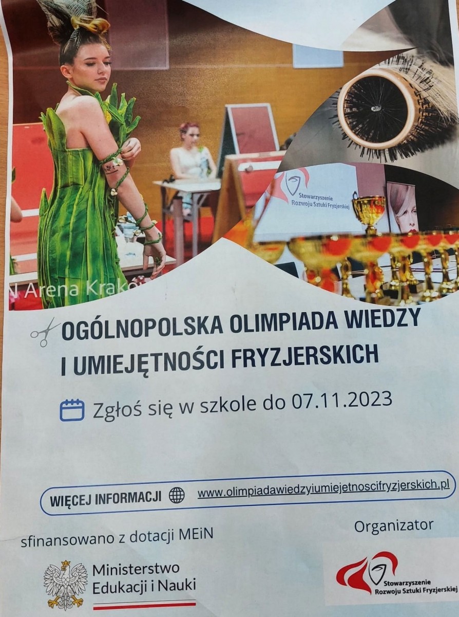 28 listopada 2023r. uczniowie branży fryzjerskiej, z klas 2 i 3 wzięli udział w I etapie Ogólnopolskiej Olimpiady Wiedzy i Umiejętności Fryzjerskich, sfinasowanej z dotacji MEiN. Szkołę reprezentowały dwa dwuosobowe zespoły w składzie: Oskar Błauciak i Małgorzata Kisztal z klasy 2 oraz Julita Jackiewicz i Kinga Więckowska z klasy 3. Obie grupy uzyskały po 34 punkty i oczekują na informacje dotyczące udziału w kolejnym etapie Olimpiady.