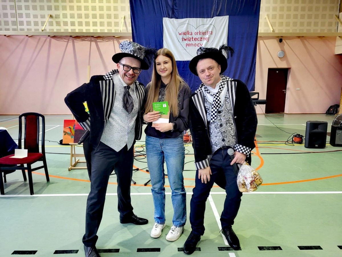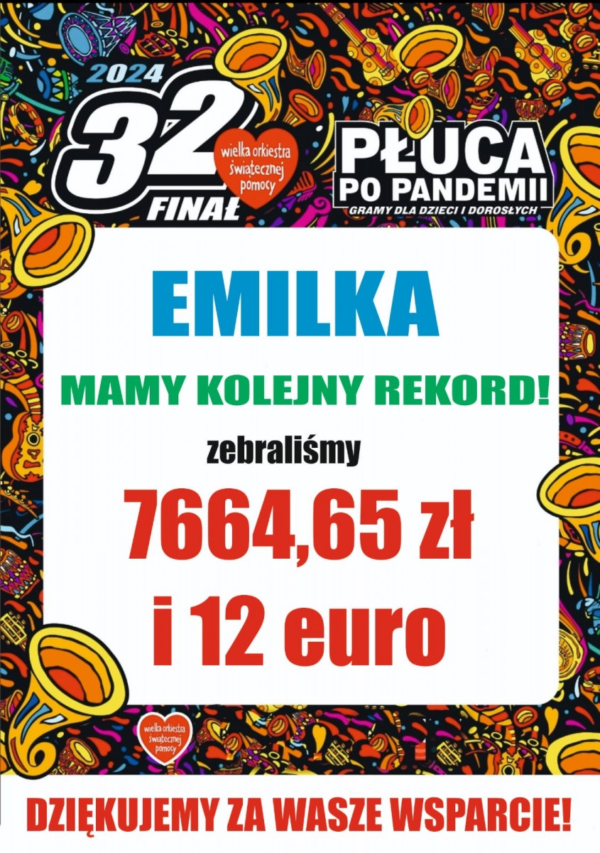 Dzięki Waszej hojności kolejny rok z rzędu udało się zebrać w szkole rekordową sumę - zebraliśmy 7664,65złotych i 12euro!!!!. Nie byłoby to możliwe bez zaangażowania wielu osób. Dziękujemy Wam wszystkim za udział i aktywne licytowanie. Szczególne podziękowania należą się m.in.: Panu Dariuszowi Krawcowi i kierowanemu przez Niego zespołowi szkolnemu, Pani Magdalenie Kempfert za przygotowanie plakatów, Pani Adriannie Kokot za upieczenie wraz z klasą IIG ciasteczek i prowadzącym Nasz szkolny finał Panom: Pawłowi Niedzieli i Marcinowi Zarębie - jak zawsze stworzyli niepowtarzalne show. Pani Joanta Wdowska - szkolny koordynator WOŚP dziękuje Samorządowi Uczniowskiemu, a szczególnie jego przewodniczącemu za pomoc i zaangażowanie w przygotowanie i sprawne przeprowadzenie finału. Jednak finał i rekordowa suma nie byłyby możliwe bez Was - uczennic i uczniów, sponsorów oraz pracowników szkoły.