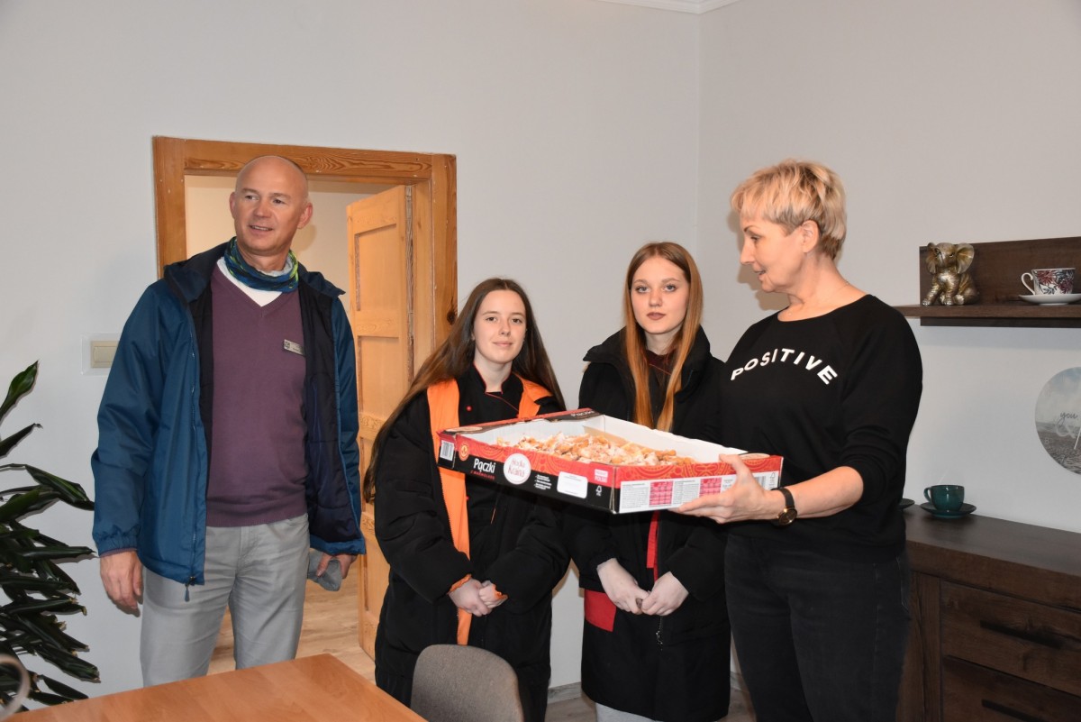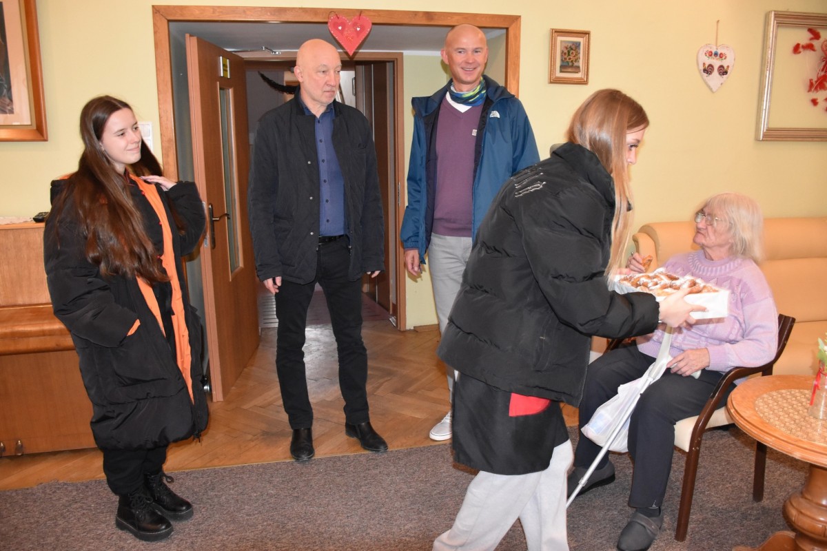 Uczniowie wraz ze starostą oraz dyrekcją szkoły przekazali słodkości mieszkańcom Domów Pomocy Społecznej