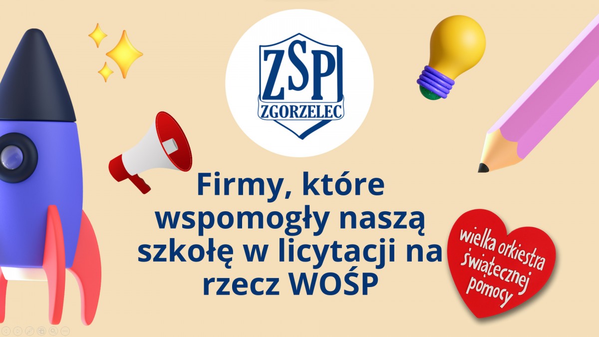 Bardzo dziękujemy firmom, które wsparły naszą Szkołę w licytacjach na rzecz WOŚP. Jesteśmy wdzięczni za wsparcie, hojność, zaangażowanie i zaufanie. Pełna lista sponsorów znajduje się w prezentacji, którą przygotowali uczniowie kl.2R: Wiktor Lisakowski i Krzysztof Reutt.