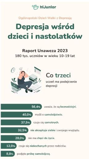 Wśród badanych dzieci i młodzieży 56,4% uważa, że są beznadziejni a 32,5% nie akceptuje siebie i swojego wyglądu. Przerażające 40% młodzieży myśli o samobójstwie a co trzeci uczeń ma podejrzenie depresji.