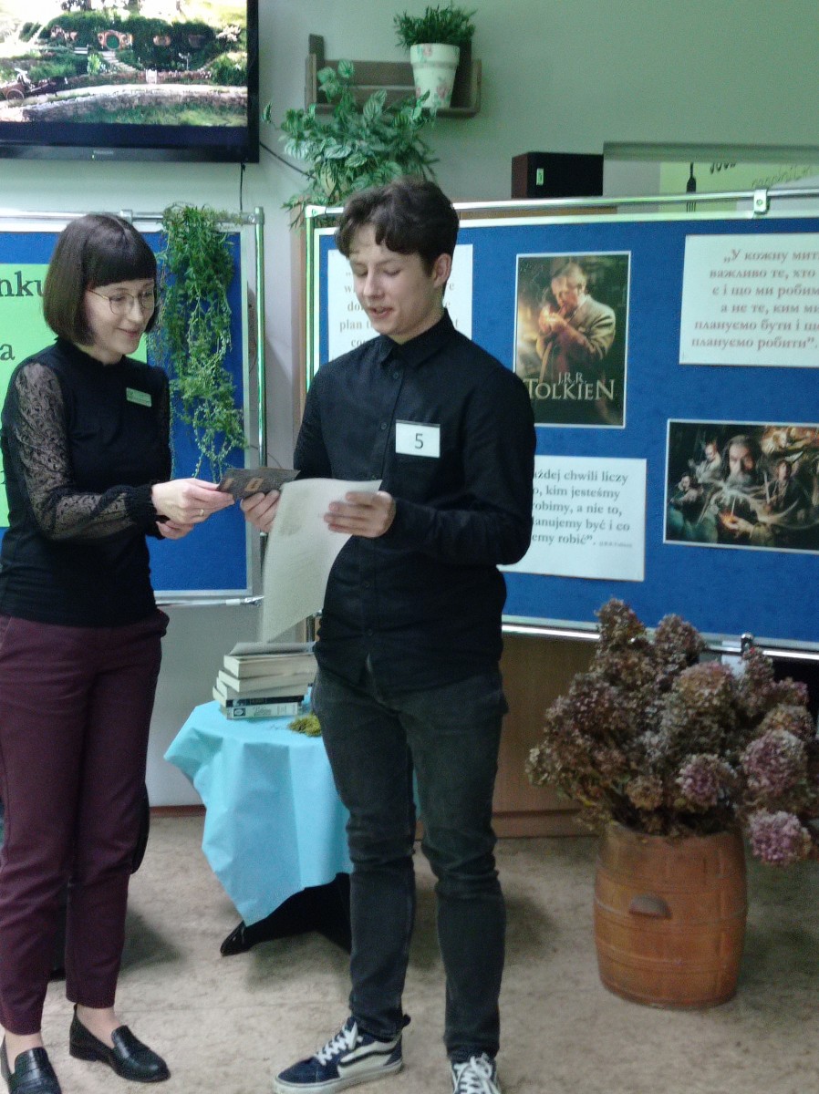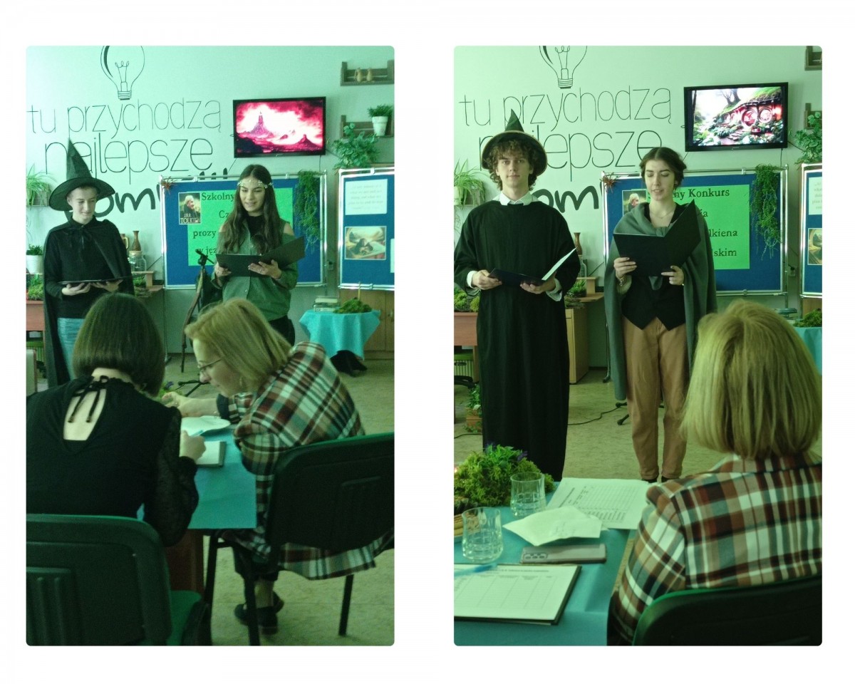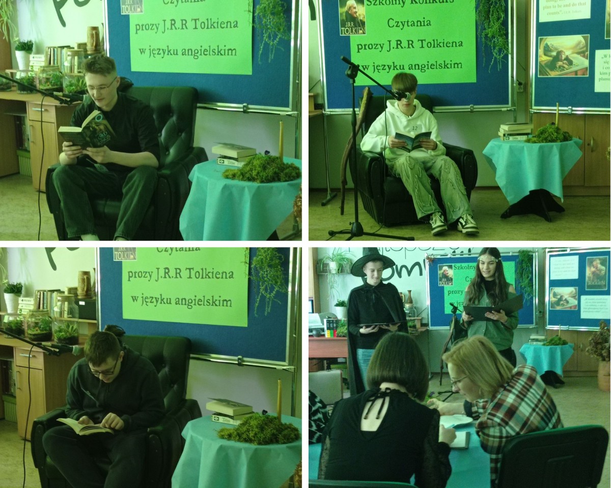 Spotkanie pięknie poprowadzili: Weronika Senkowska, Szymon Goś, Maryna Yefremova z kl.3LE oraz Maksym Babii z kl.1SE. Prezentując się w strojach nawiązujących do postaci występujących w czytanych dziełach przedstawili krótki życiorys pisarza, a następnie przed każdym występem prezentowali ciekawostki z życia J.R.R. Tolkiena, które zostały odczytane w językach: polskim i ukraińskim.