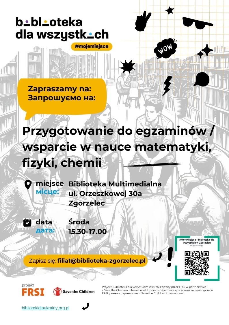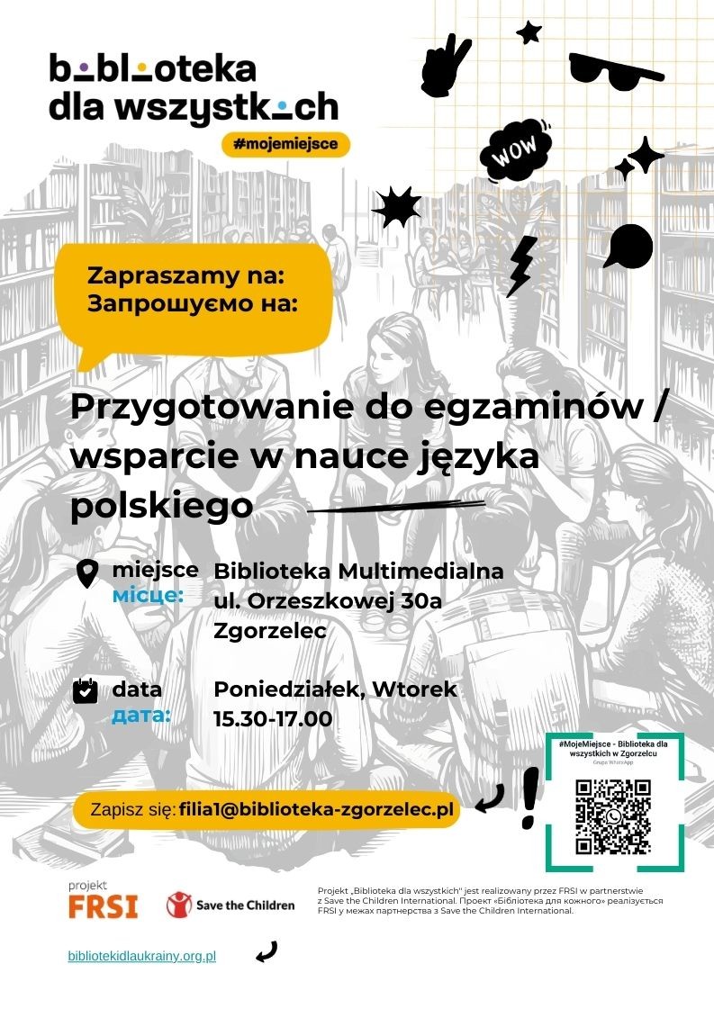 Міська публічна бібліотека в Згожельці запрошує польську та українську молодь до набору в групи підготовки до шкільних екзаменів. Польські та українські учні, які навчаються у 8-му класі початкової школи, 4-му класі середньої школи або 5-му класі технікуму та готуються до екзамену за восьмий клас або до екзамену на закінчення середньої школи, можуть отримати допомогу з польської мови, математики, або сучасної іноземної мови від досвідчених викладачів під час додаткових зустрічей у бібліотеці.