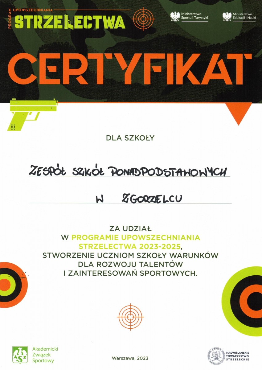 Ponad 100 naszych uczniów mogło się cieszyć z udziału w zajęciach prowadzonych przez zawodowego instruktora strzelectwa AZS, a szkoła właśnie otrzymała certyfikat