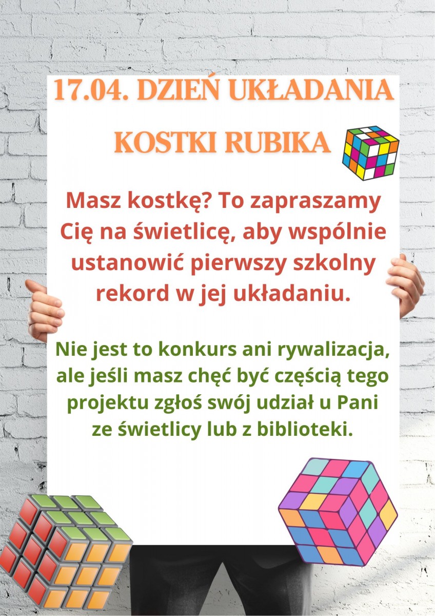 Miłośników układania kostki Rubika: 2x2, 3x3, 4x4, 5x5, piramidy i każdej innej, zapraszamy 17 kwietnia do wspólnej zabawy. Zgłoszenia przyjmujemy do 12 kwietnia w bibliotece lub na świetlicy, a szczegóły znajdują się na plakacie.