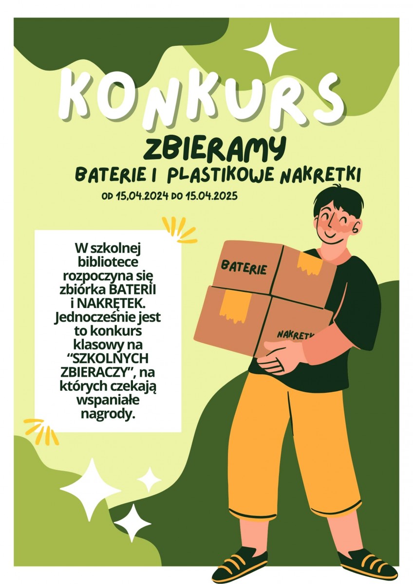 Od 15 kwietnia 2024r. do 15 kwietnia 2025r. zbieramy zużyte baterie oraz plastikowe nakrętki, które przynosimy do szkolnej biblioteki, które po zważeniu zostaną wpisane na konto danej klasy.