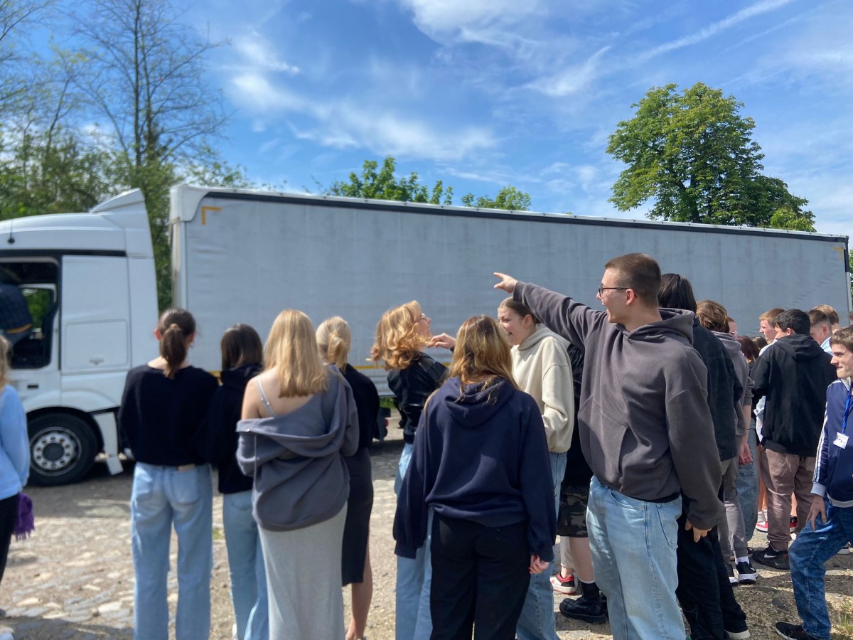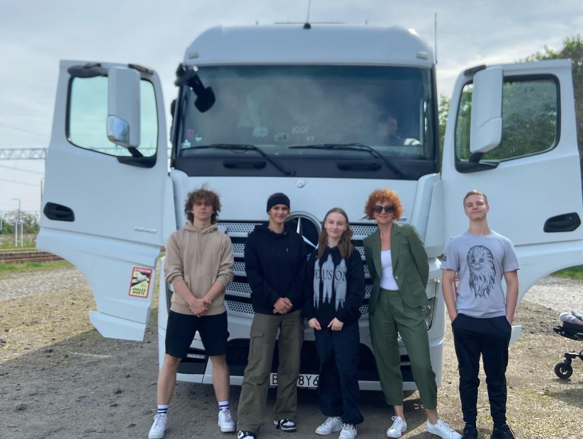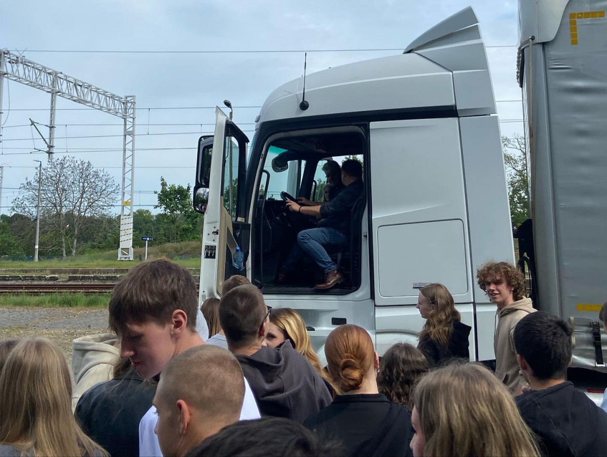 Pan Grzegorz Gosiewski - zawodowy kierowca i wlaściciel firmy transportowej jadąc z ładunkiem do Francji zgodził się pokazać nam zasady obsługi ciągnika z naczepą, mocowanie ładunku oraz zasady pracy kierowcy w trasie.... Mogliśmy wejść do kabiny kierowcy, zobaczyć jak wszystko wygląda z góry, obejrzeć tachografy i posłuchać o pracy kierowcy w trasie..... Dziękujemy.....
