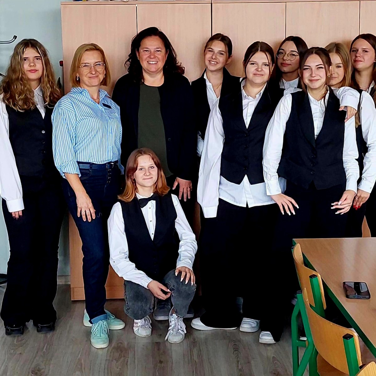 - warsztaty hotelarskie - nasze uczennice z klasy drugiej przygotowały welcome breakfast - pani Anna zapoznała się z zespołem dyrekcyjnym, a młodzież zaprezentowała swoje umiejętności praktyczne: parzenia kawy, przygotowania i serwowania śniadania oraz metod składania serwetek