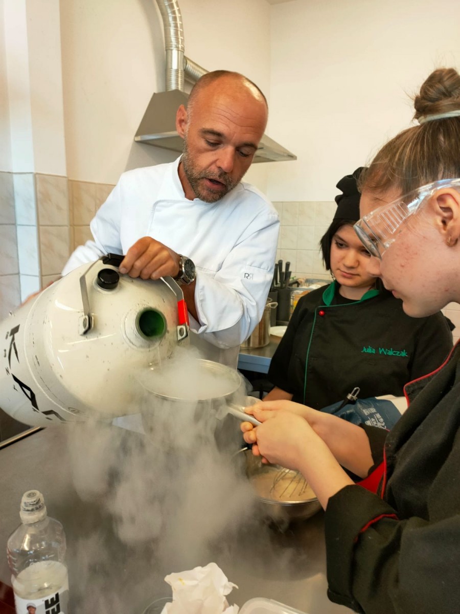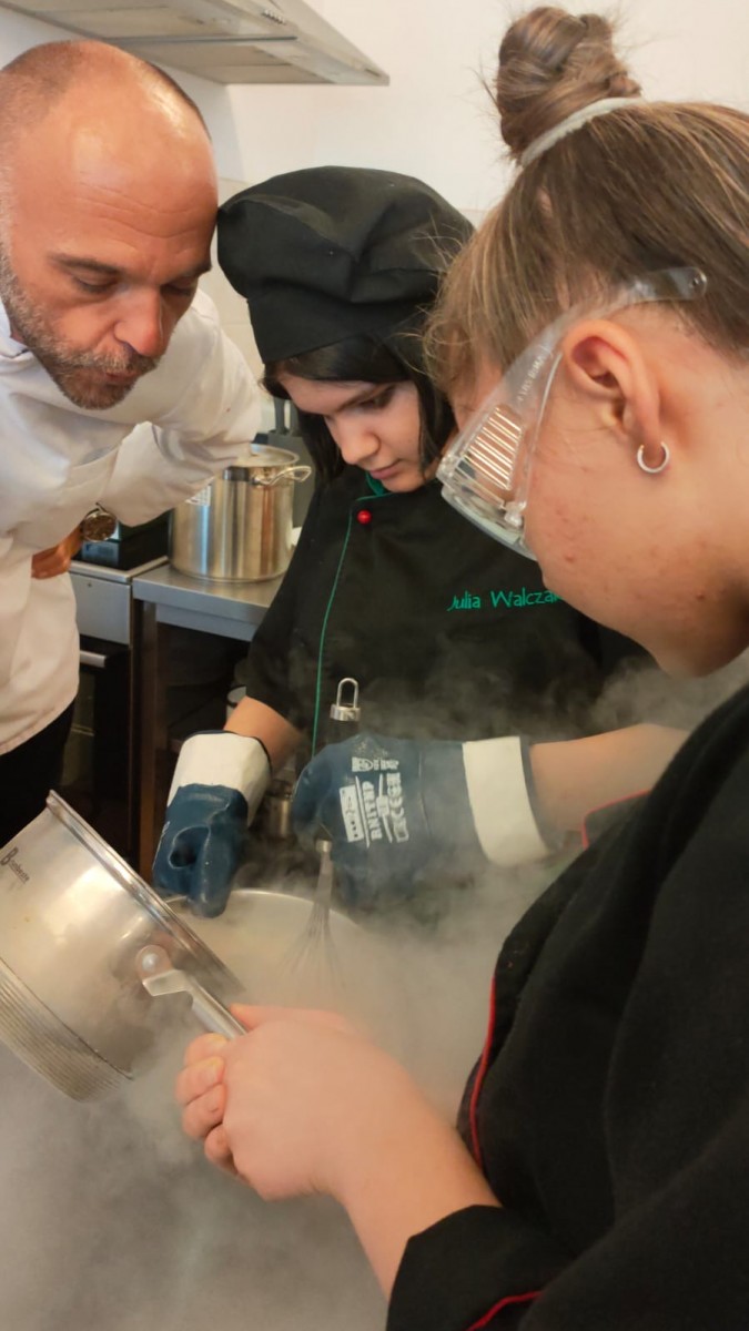 Tajemnicza „kuchnia molekularna” odkrywa swoje tajemnice przed uczniami 3G i 3K podczas szkolenia w ramach projektu „Kariera zawodowców e naszych rękach bis”. Szkolenie poprowadził Pan Dariusz Smolarczyk a projekt możemy realizować dzięki UPEMI z Warszawy oraz Starostwu Powiatowemu w Zgorzelcu