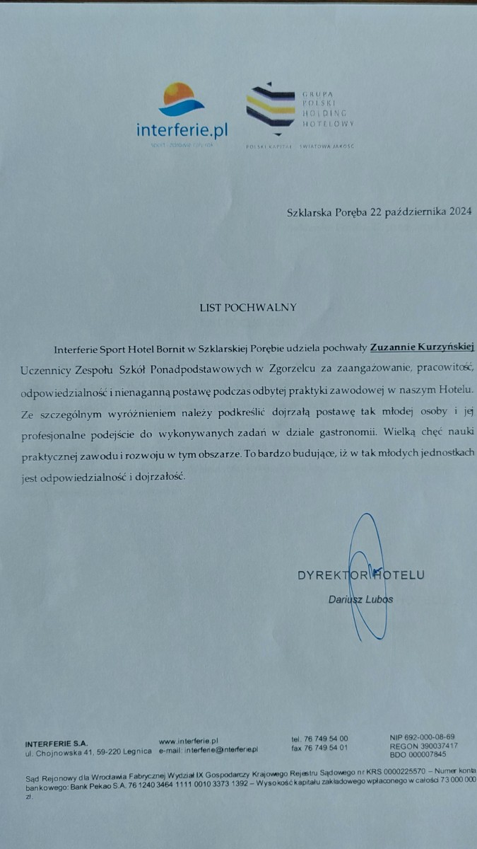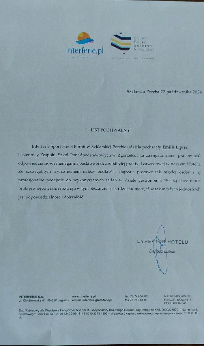 Dyrektor Interferie Sport Hotel Bornit w Szklarskiej Porębie przekazał dyrekcji szkoły listy pochwalne podkreślające wyjątkową postawę uczennic podczas miesięcznej praktyki zawodowej. Docenione zostało ich zaangażowanie, pracowitość, odpowiedzialność i profesjonalizm oraz wysoka kultura osobista. Brawo dziewczęta!