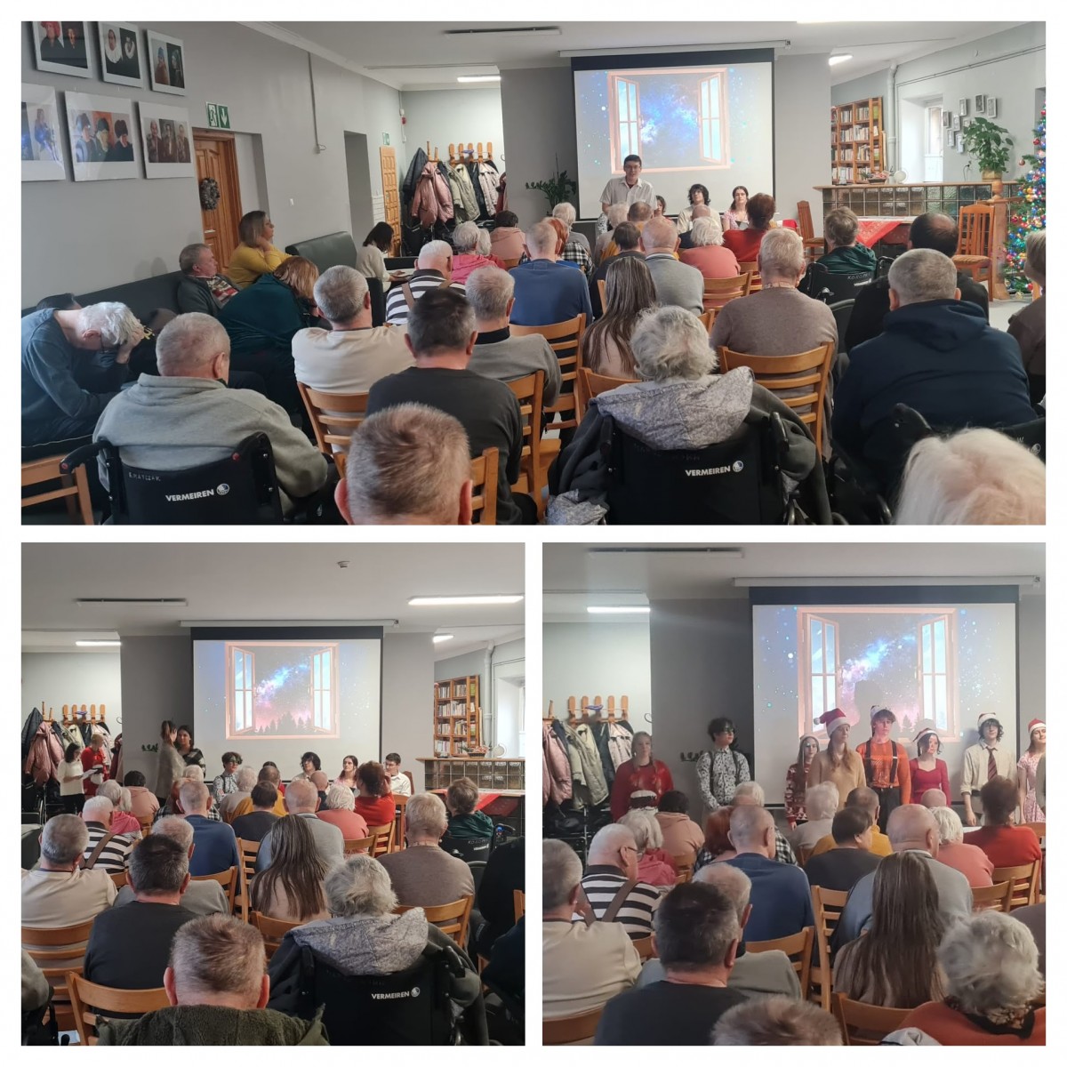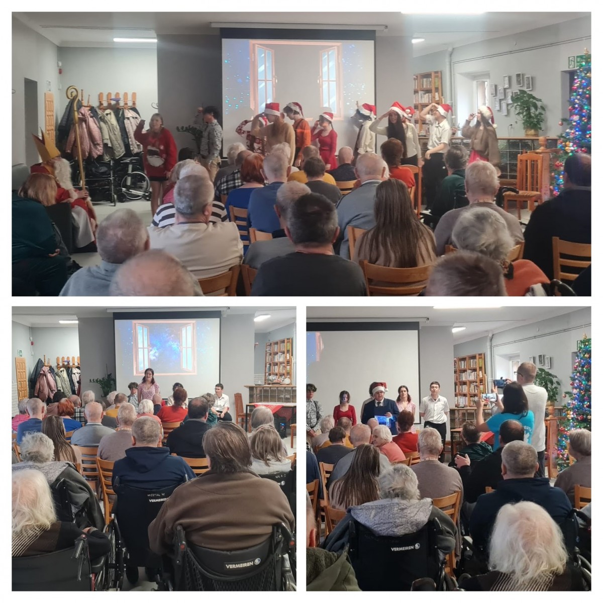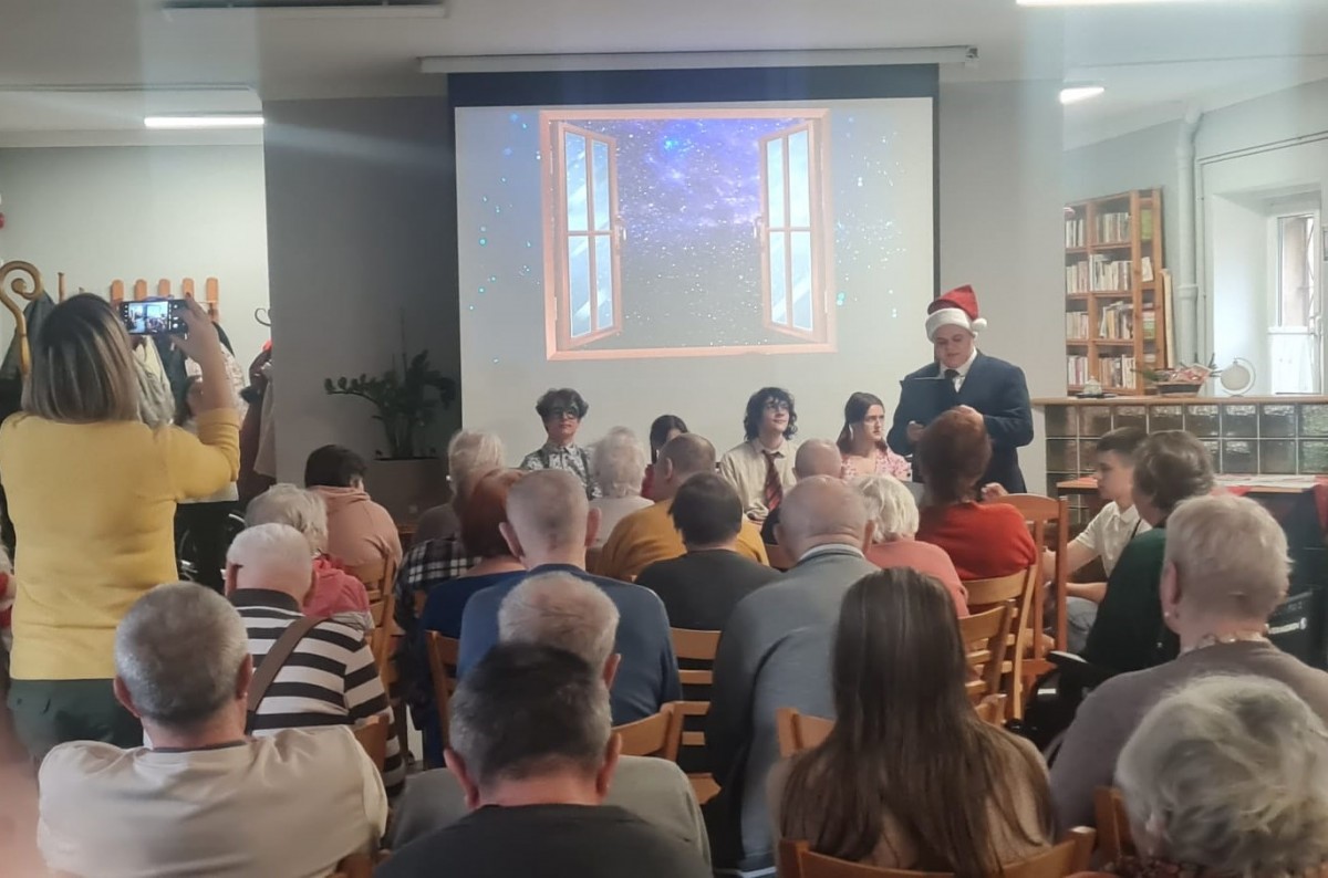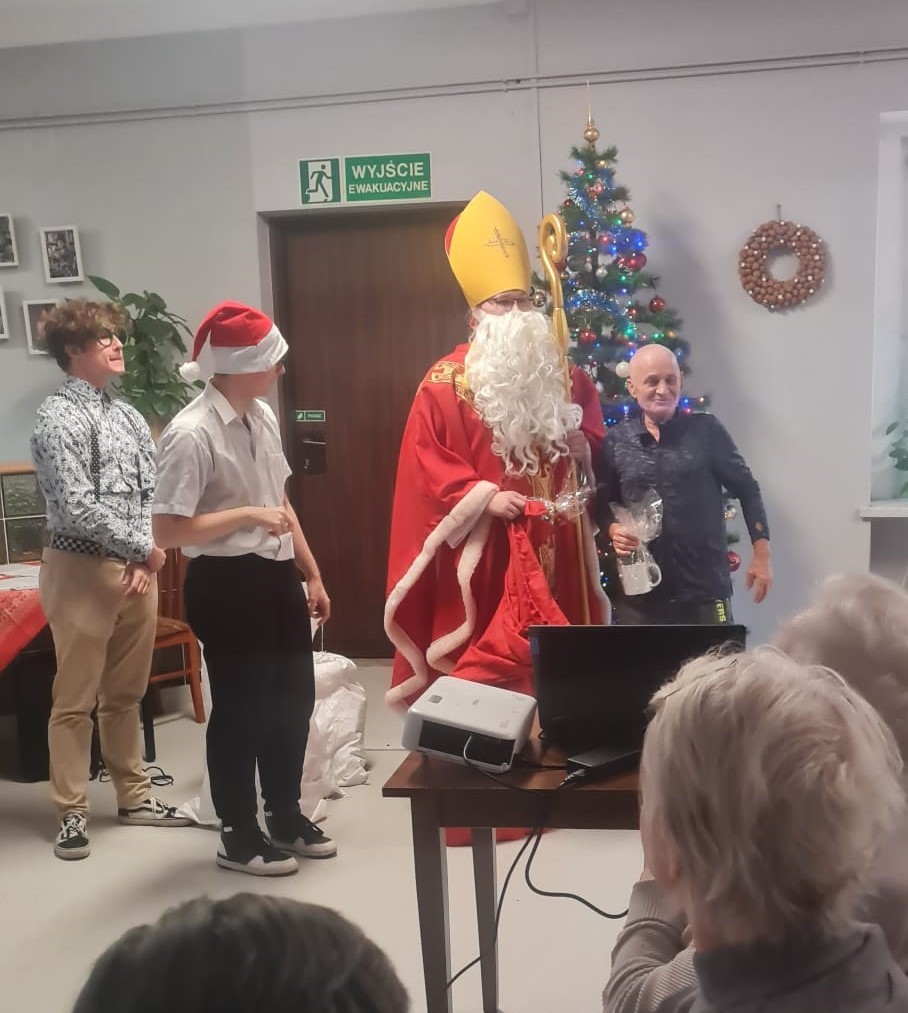 Zaprezentowali je na tle pięknej prezentacji oraz świątecznych melodii przygotowanych przez ucznia klasy 5RS. Występ uświetnił wspólny taniec wykonany przez szkolnych aktorów. Punktem kulminacyjnym wydarzenia było oczywiście spotkanie ze św. Mikołajem biskupem i …. prezenty. W towarzystwie dwóch pomocników, Mikołaj zapraszając imiennie każdego mieszkańca, osobiście wręczał upominki, które wcześniej przygotowaliśmy w szkole.