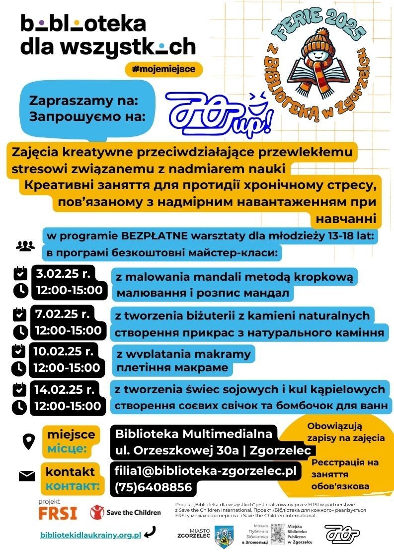 Biblioteka Multimedialna w Zgorzelcu zaprasza młodzież w wieku 13-18 lat na bezpłatne warsztaty w czasie ferii zimowych. Szczegóły na plakacie.