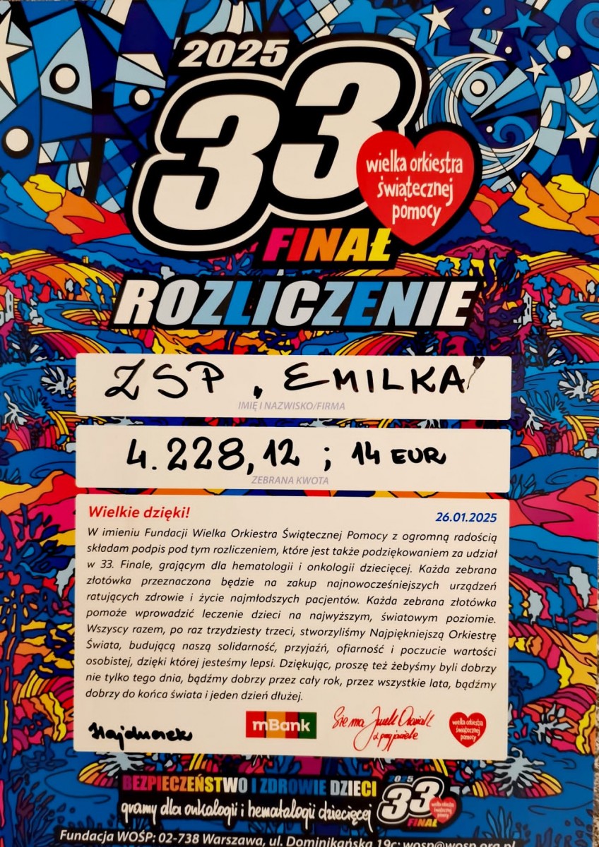 W ostatni piątek tj. - 24. stycznia 2025 r. po raz kolejny zagraliśmy dla Wielkiej Orkiestry Światecznej Pomocy. Dzięki Waszej hojności zebraliśmy kwotę : 4 228,12 zł i 14 Euro.