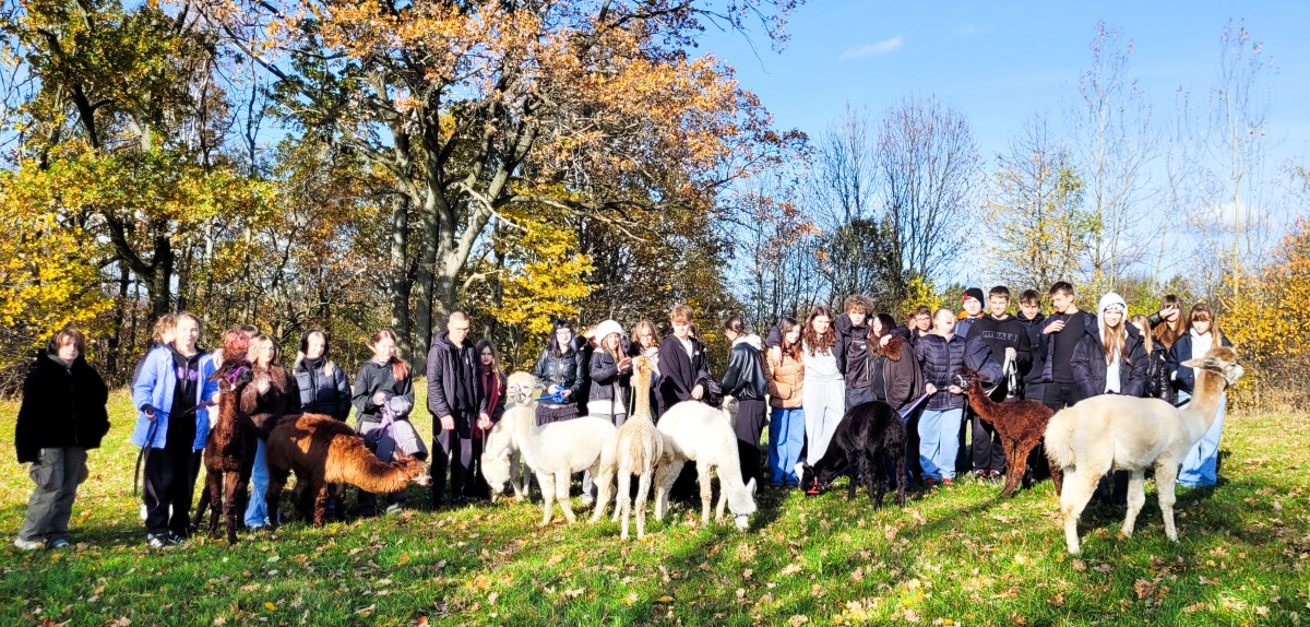Korzystając z przepięknej pogody, uczniowie z klasy 1ER razem z grupką z 2RG, wybrali się na wyjątkową wycieczkę integracyjno-edukacyjną do urokliwego miejsca: "Alpaki z Proszówki".