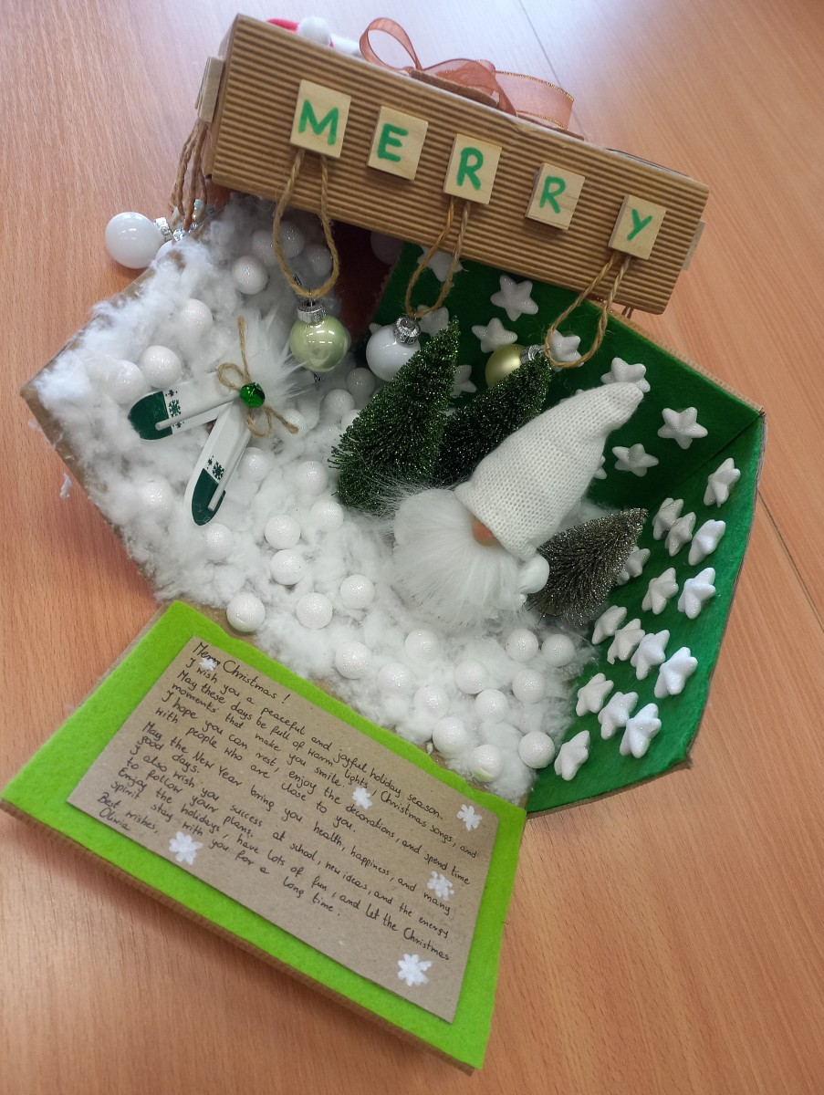 Konkurs plastyczny z elementami wiedzy o krajach anglojęzycznych polegał na wykonaniu świątecznej kartki dowolną techniką oraz załączeniu życzeń w języku angielskim.