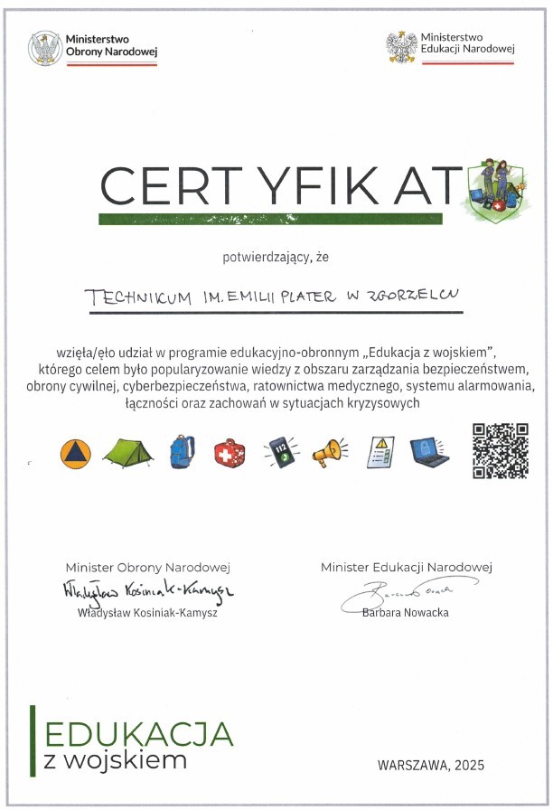 Nasza szkoła wzięła udział w programie edukacyjno - obronnym "Edukacja z wojskiem", którego celem było popularyzowanie wiedzy z obszaru zarządzania bezpieczeństwem, obrony cywilnej, cyberbezpieczeństwa, ratownictwa medycznego, systemu alarmowania, łączności oraz zachowań w sytuacjach kryzysowych. Program jest współnym przedzięwzięciem Ministerstwa Obrony Narodowej i Ministerstwa Edukacji Narodowej.