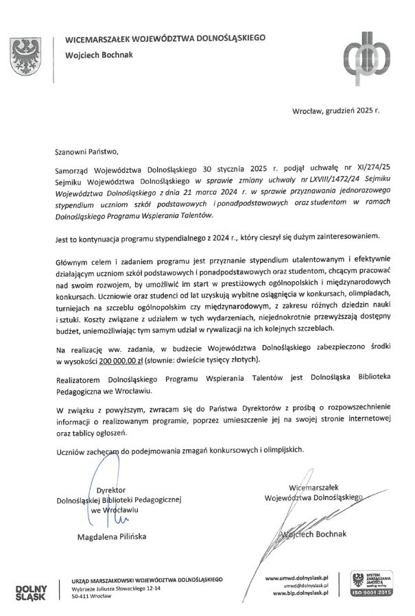 Drodzy Rodzice i Uczniowie. W załączeniu zamieszczamy pismo Wicemarszałka Województwa Dolnośląskiego, pana Wojciecha Bochnaka w sprawie stypendiów dla uczniów w ramach Dolnośląskiego Programu Wspierania Talentów w roku 2026. Prosimy o zapoznanie się z jego treścią (zdjęcie w rozwinięciu artykułu).