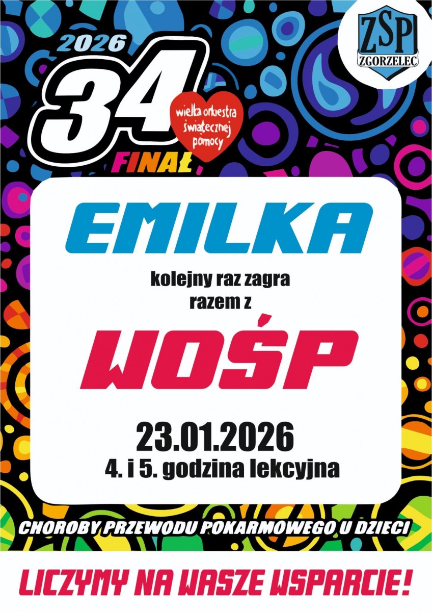 W piątek tj. 23. stycznia 2026 r. na 4. i 5. godzinie lekcyjnej w Naszej szkole odbędzie się 34 finał Wielkiej Orkiestry Świątecznej Pomocy.