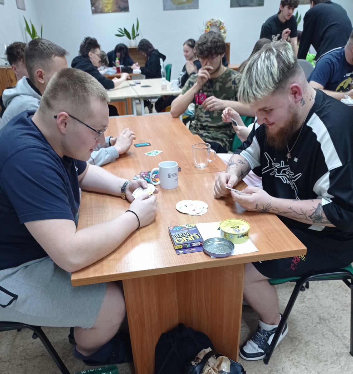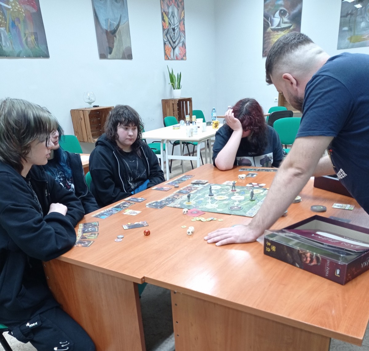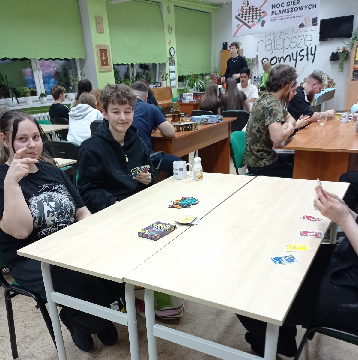 Przez całą noc młodzież grała w swoje ulubione gry, wśród których znalazły się m.in. Star Realms, Dungeons & Dragons (D&D), Spicy, Monopoly, Everdell, Dalekobrzeg, Boss Monster, Catan, Rummikub, Uno, Skull oraz wiele innych tytułów cieszących się dużym zainteresowaniem. Szczególną popularnością cieszyła się także Mafia, którą – jak zawsze profesjonalnie – poprowadził ekspert w tej dziedzinie, Kuba Nawrocki.
